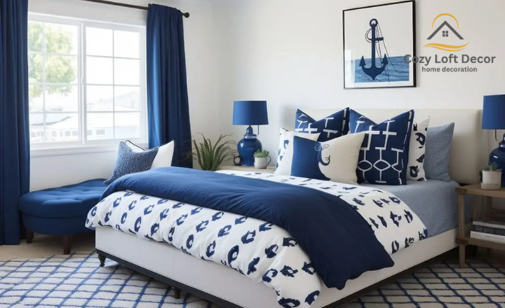 Navy blue and white create a crisp, timeless bedroom combination that feels both bold and beautifully clean. Navy brings richness and depth, giving the room a calm, cocoon-like vibe. White balances it out with brightness and freshness, keeping the space from feeling heavy.