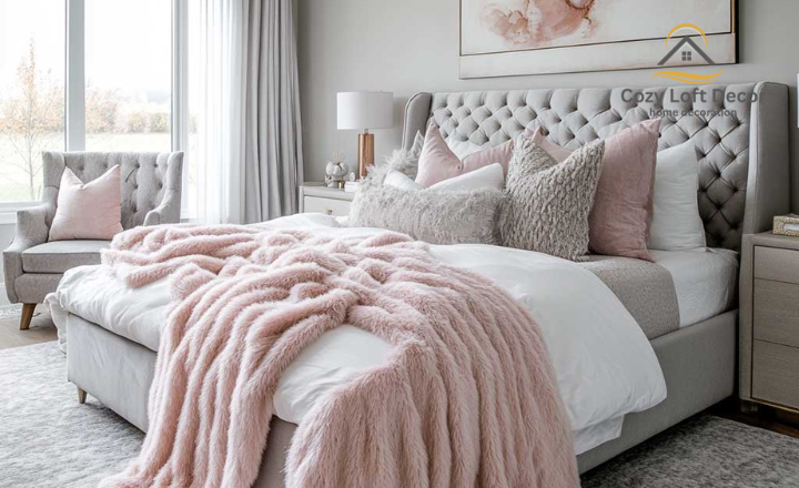 A blush pink and grey bedroom exudes elegance and modern charm. The soft blush pink adds warmth and a touch of femininity, while grey brings balance and sophistication. Together, they create a serene and cozy atmosphere ideal for relaxation.