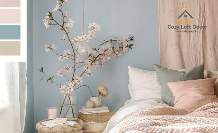 Light wood furniture and simple decor pair beautifully with this palette. Natural light makes the colors glow and keeps the room feeling open. Overall, this combo delivers a peaceful, bright, and timeless bedroom atmosphere.
