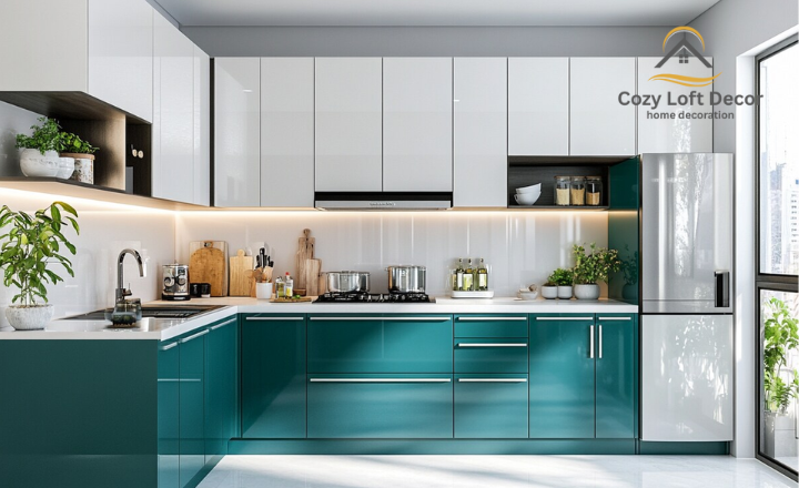 This pairing works beautifully for accent walls, cabinets, or decorative elements, creating a balanced and stylish look. Teal and white also complement natural wood, marble, and metallic finishes, enhancing the modern aesthetic. This combination is ideal for kitchens that aim to be bold, elegant, and timelessly chic.