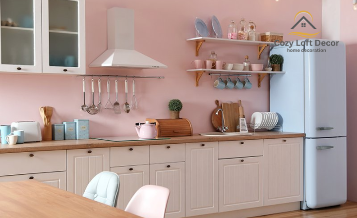 Pastel pink and white form a soft, charming, and inviting kitchen wall colour combination. Pastel pink adds a gentle warmth and subtle playfulness, while white keeps the space bright, clean, and airy. This pairing works beautifully in both modern and classic kitchen designs, creating a delicate and elegant atmosphere.