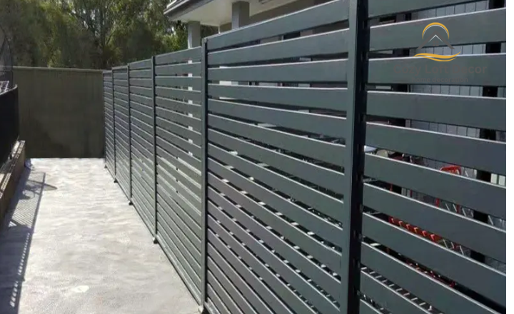 A horizontal aluminum fence combines modern design with durability and low maintenance. Its horizontal slats create a sleek, contemporary look while providing security and structure. Aluminum is lightweight, rust-resistant, and long-lasting, making it ideal for various climates.