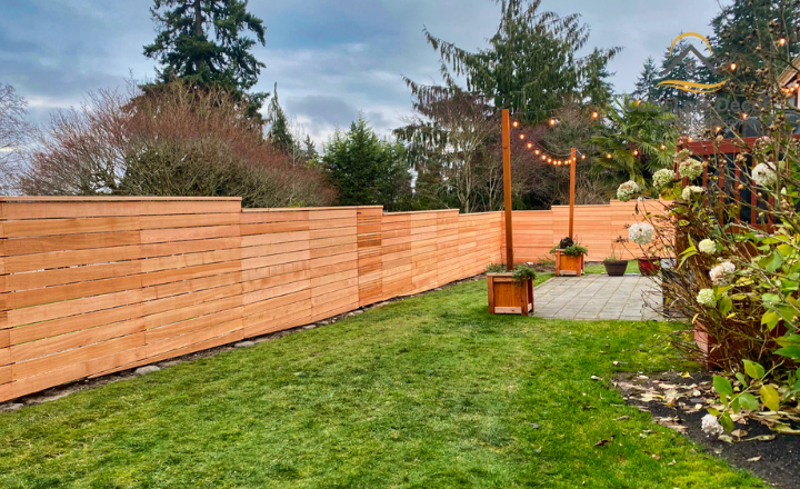 A horizontal cedar fence combines the natural beauty of cedar wood with a sleek, modern design. Its horizontal slats create clean lines that enhance the visual appeal of any outdoor space. Cedar is naturally resistant to rot and insects, making it a durable and long-lasting option.