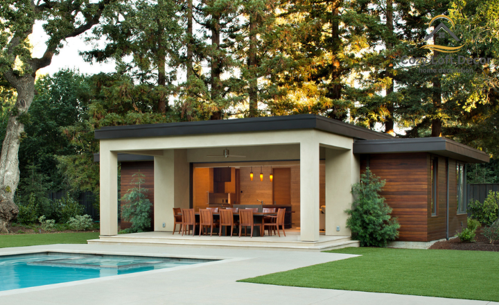 - Outdoor Integration Features Design the small pool house to feel larger by incorporating large windows or glass doors that create visual connections to the outdoor pool area and landscape. Add a small covered patio or deck area adjacent to the structure to provide additional outdoor living space without expanding the building footprint.